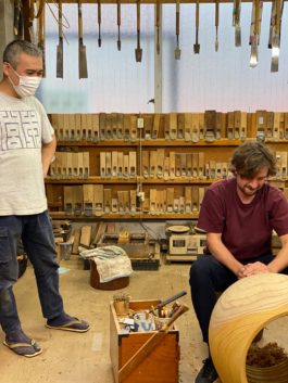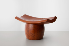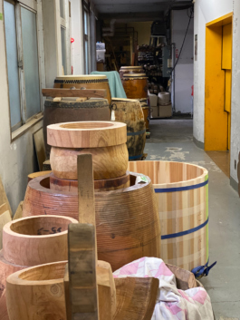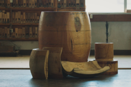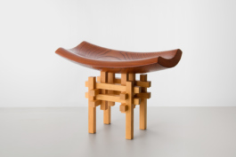 EN Re-Taiko stools were created in collaboration with Miyamoto Unosuke as part of the Edo Tokyo Kirari program. Miyamoto Unosuke is specialized in making drums and other musical instruments as well as traditional portable shrines and festival equipment. During the wood drying process, some drum barrels split and can no longer be used to make musical instruments. These drums and their characteristic shapes are transformed into seats that follow the curves of the body and give new life to the company's zelcova wood.