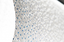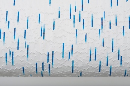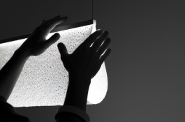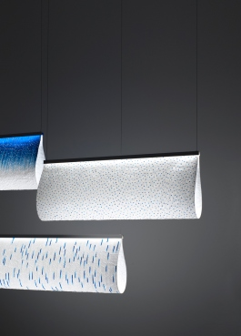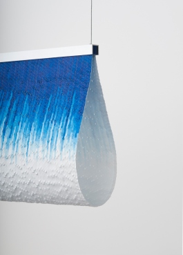 FR Les lampes Pinceau sont constituées d’un ruban de leds et un profilé d’aluminium pour la partie éclairante, un tissage de papier et de nylon diffuse la lumière. Au travers de papiers colorés au pinceau, découpés puis tissés à la main, le bleu créé différents motifs ponctués de reliefs aléatoires. Trois tissages différents sont disponibles: Orage, Ondée et Bruine.