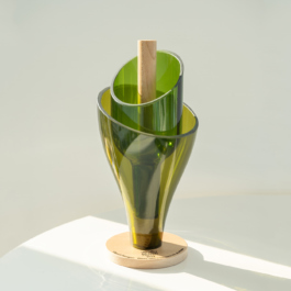 EN Participants of the 14th Verallia Design Award were invited to consider the theme “Glass to live the moment”. We designed a trophy for the occasion, it is composed of a Bordeaux bottle and a Bourgogne magnum, both part of Verallia standard catalogue. They are cut and mounted on a wooden base, their distinctive shapes and colors giving the trophy its unique identity.