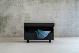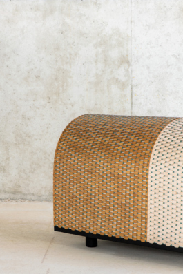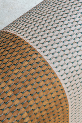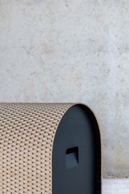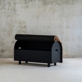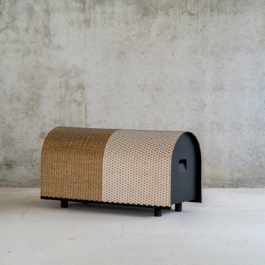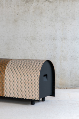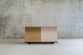EN Armadillo chest is covered with a wooden weaving matching the shape of a rounded box. This flexible lid delicately reveals the contents of the cabinet when lifted. The material developed by textile designers Lily Alcaraz & Léa Berlier is used here as much for its decorative qualities as for its mechanical properties of strength and flexibility.