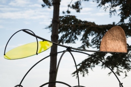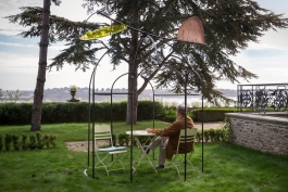 EN Séjour is a wrought iron outdoor structure composed of a gazebo and a mobile fixed at its top. The mobile changes according to variations of the natural elements to which it is exposed like wind and sun... A copper weather vane changes direction and a glass lens projects the sunlight according to its position.
