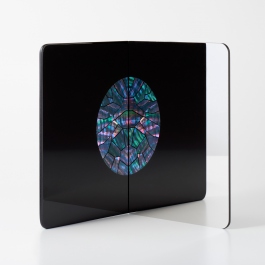 en Vison-Visu mirrors consist of two lacquered wood panels assembled with magnets. They are made with ancestral raden technique (lacquer work with mother-of-pearl inlays) and a stainless steel mirror. The big mirrors are made with mosaic work inlay.